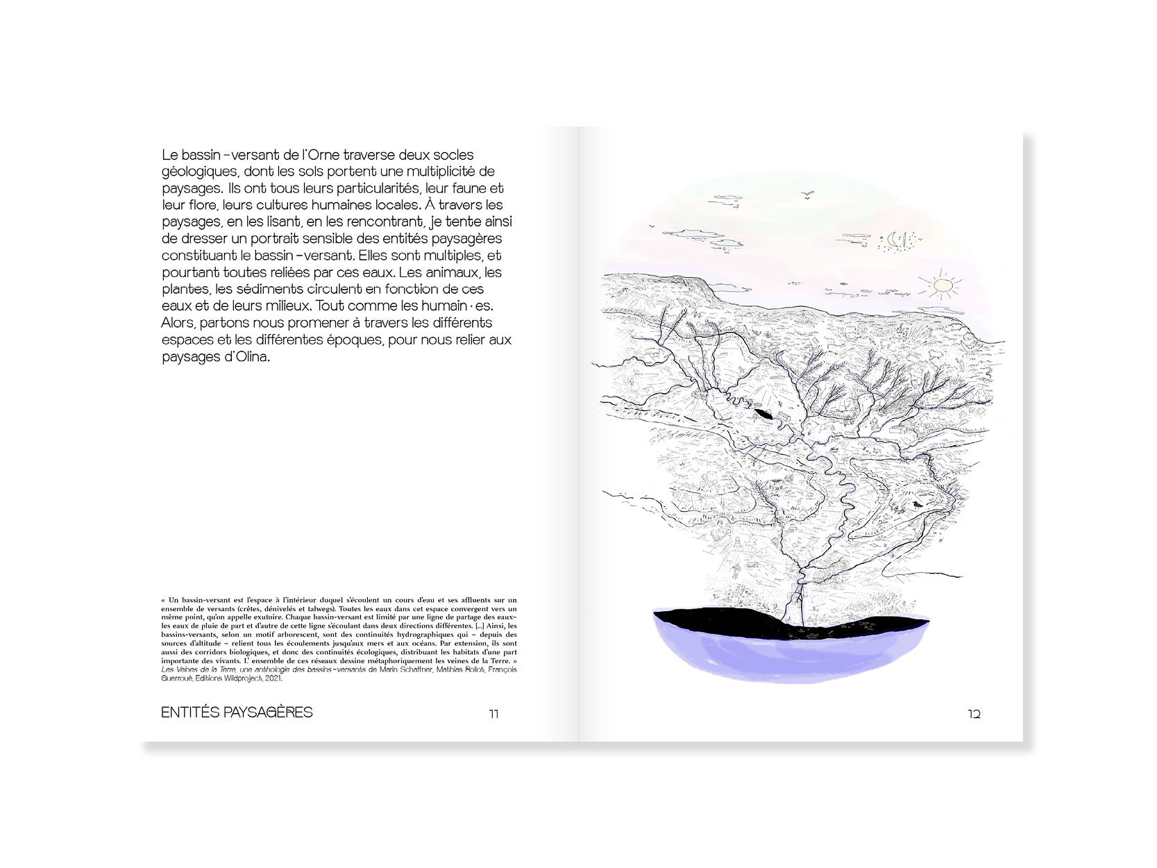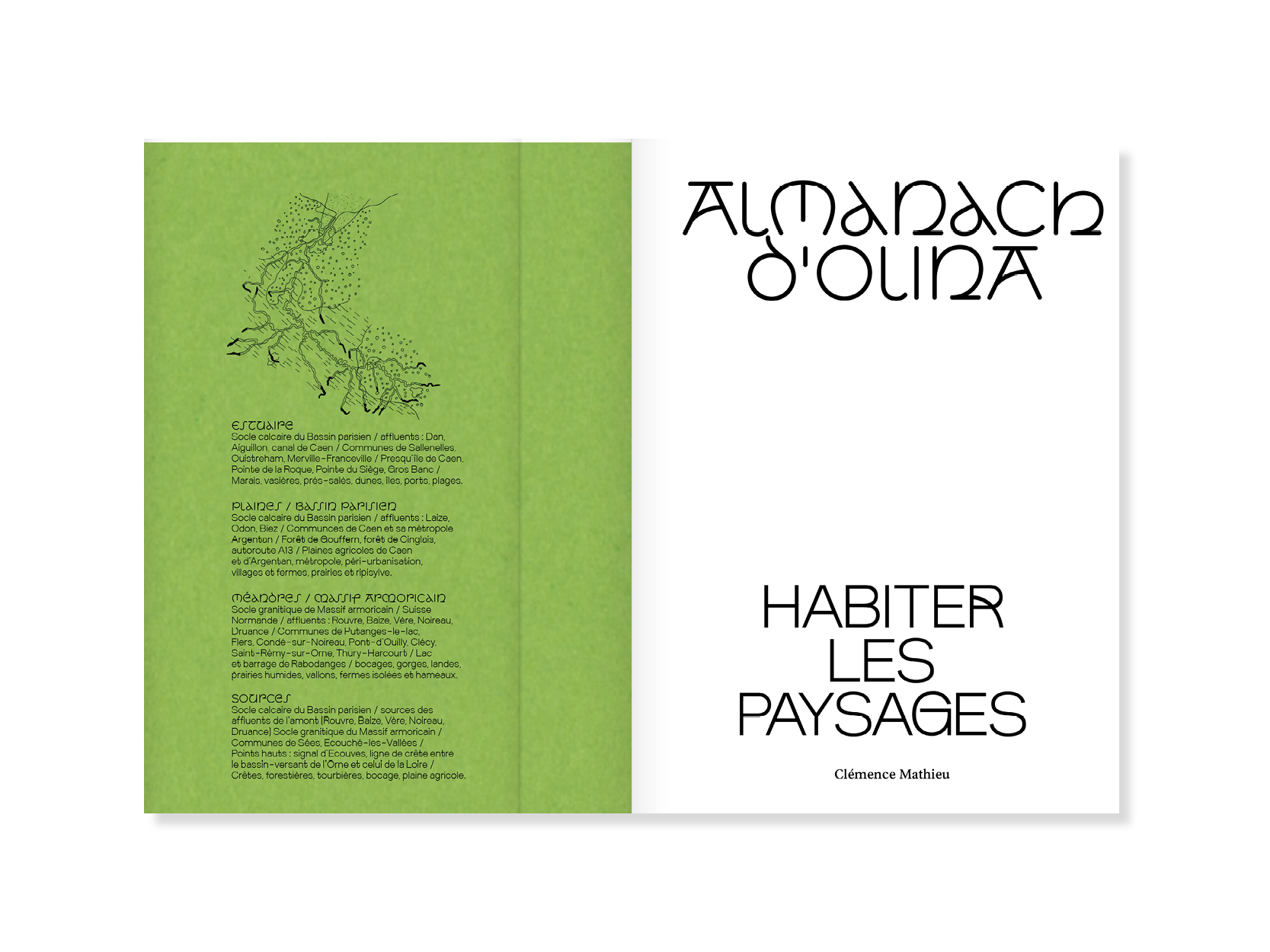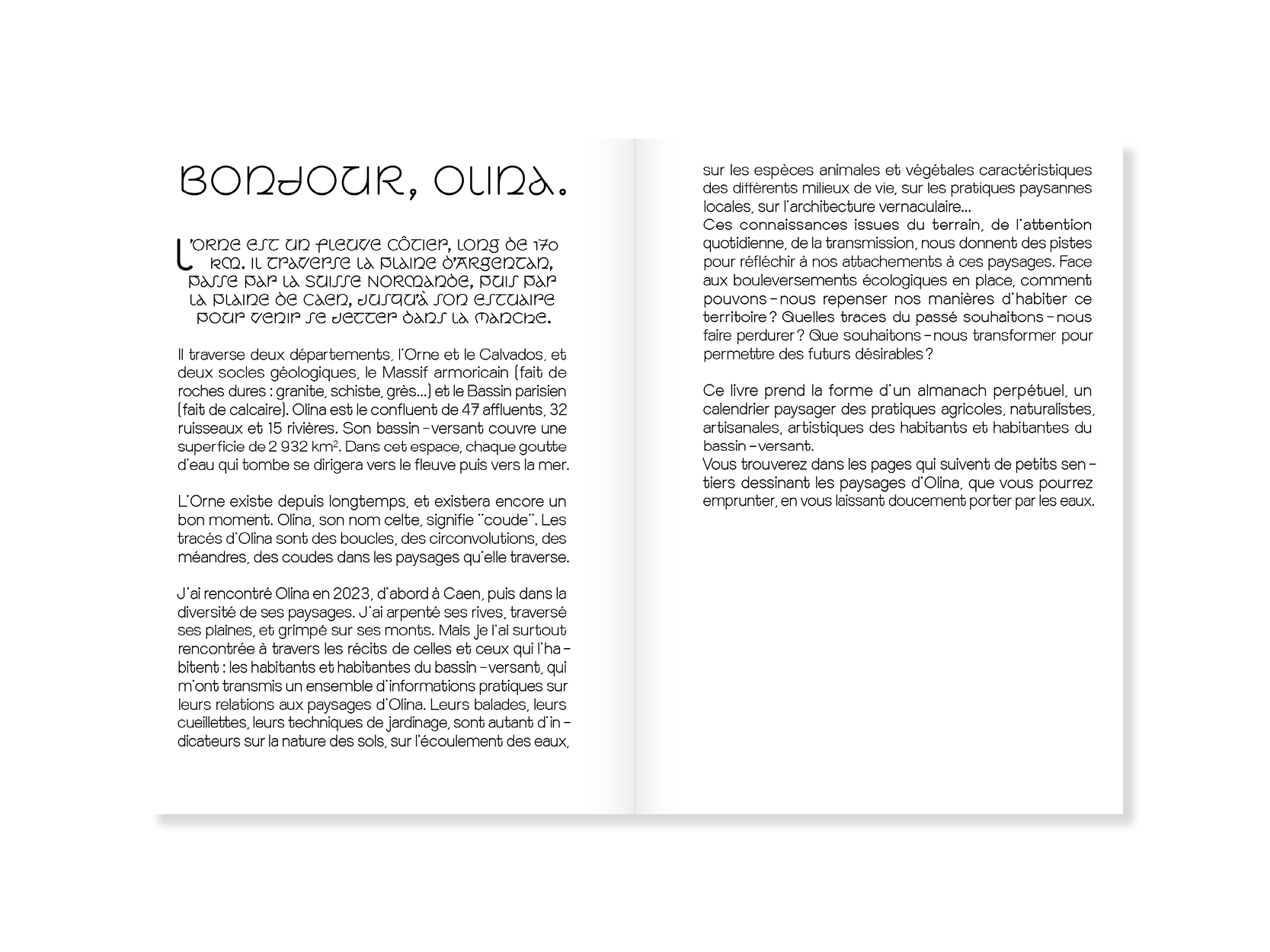 « Les tracés d’Olina forment des méandres, des coudes, des circonvolutions dans les paysages qu’elle dessine. Son bassin-versant est peuplé d’un ensemble d’êtres vivants, habitant·es traversé·es par les eaux, à la fois dans leurs corps et dans leur vie quotidienne. Cet almanach perpétuel transmet les récits de leurs attachements aux paysages d’Olina. Au rythme des saisons, des journées, de l’écoulement des eaux, les gestes et les pratiques racontés ici, peuvent aider à suivre les chemins des rivières, et à habiter avec soin les milieux de vie partagés. »