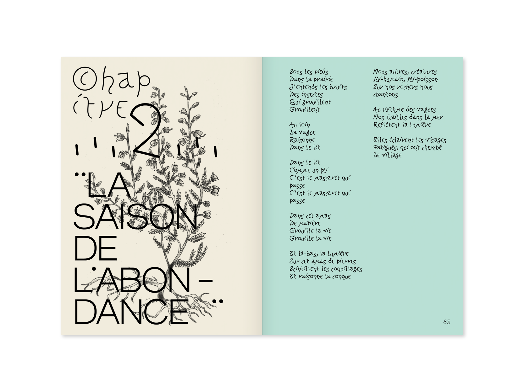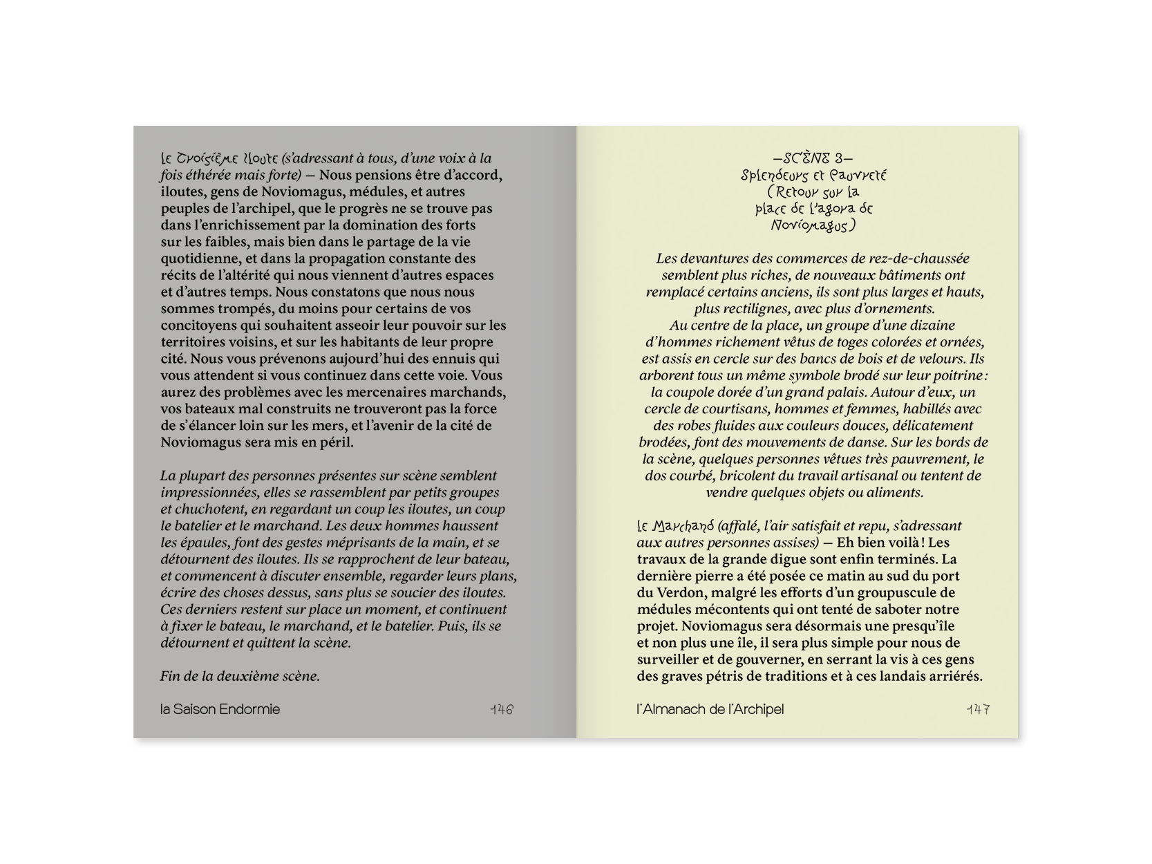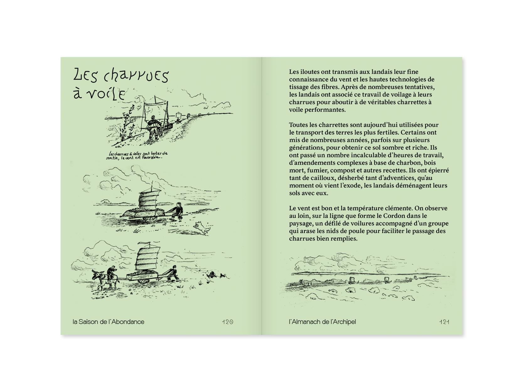 Ce livre organisé en almanach décline différentes formes littéraires et graphiques, pour narrer au fil des saisons la vie quotidienne des habitants humains et autres qu’humains d'un autre estuaire de la Gironde, celui de l'ère de l'archipel de Gironde.