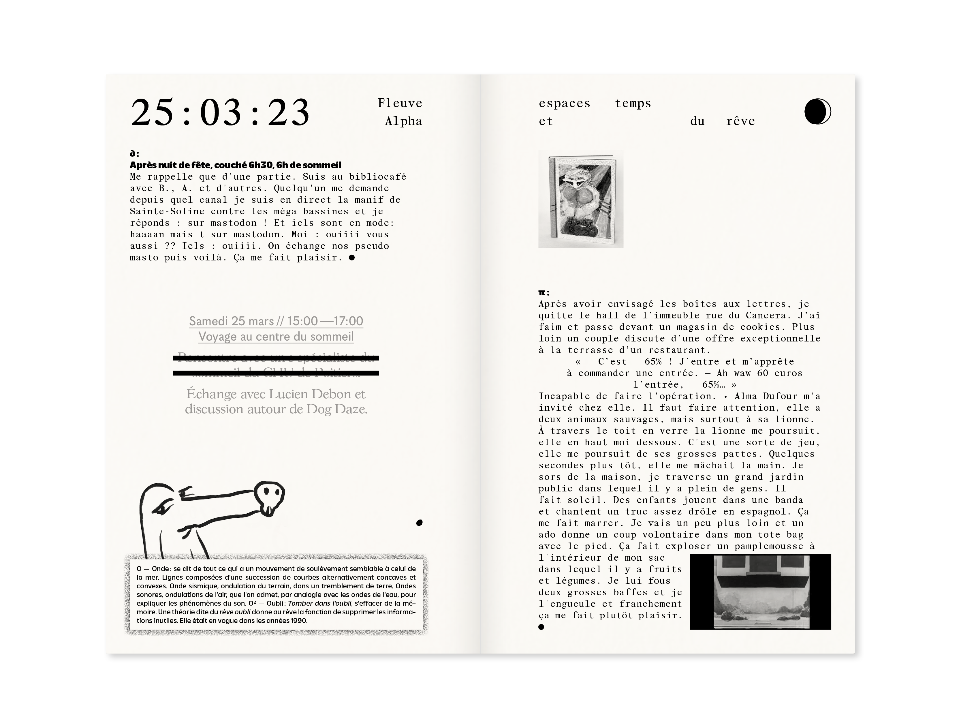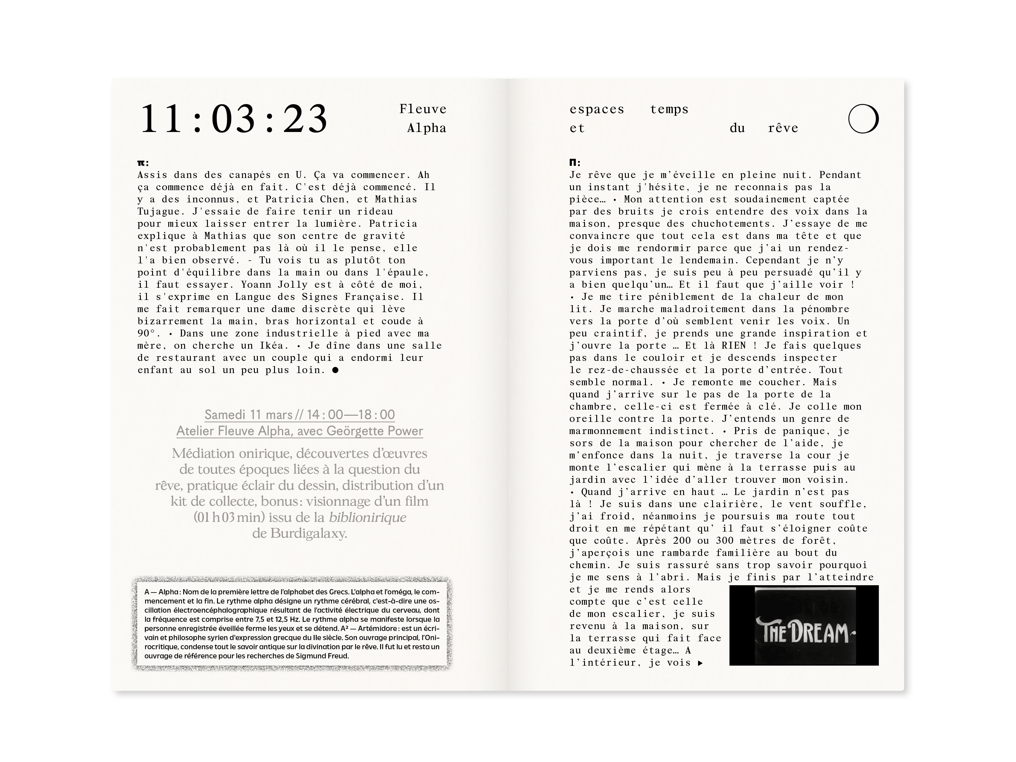 Fleuve alpha, espaces et temps du rêve est une édition réalisée à partir d'une rencontre entre trois associations (Burdigalaxy, Chantier Public, Phenicusa Press) quatre artistes associés (Geörgette Power, Bérénice Béguerie, Fabien Goutelle, Aude Le Bihan) et 12 personnes impliquées dans un workshop centré sur des pratiques d'écriture & de graphisme. Cette création éditoriale s'articule autour d'une collecte de rêves menée dans la ville de Poitiers et ses environs, et s'inscrit dans le sillage d'un projet d'archive onirique orchestré par l'association Burdigalaxy depuis 2020.