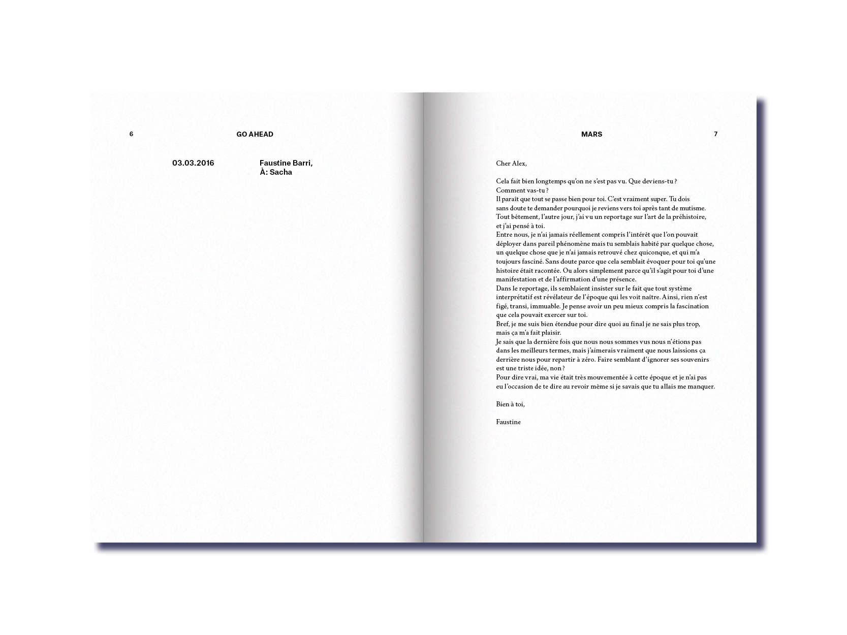 Dans Go Ahead, une certaine Faustine échange des mails avec plusieurs interlocuteurs, chacun d’eux ayant de près ou de loin étudié la question de la construction d’un personnage dans leur pratique artistique respective. Selon toute vraisemblance, Faustine aime faire penser à certains de ses interlocuteurs qu’elle entretient des relations intimes - ou tout du moins privilégiées - avec eux. Quand à savoir si elle y croit le plus sincèrement du monde ou pas, nous même, on ne sait même pas.